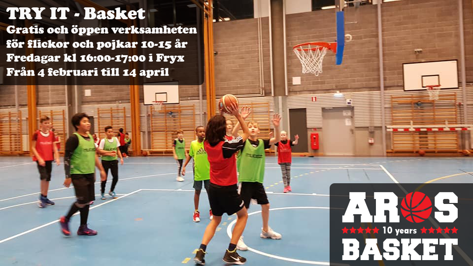 Välkomna till en gratis basketverksamhet som är öppen för flickor och pojkar 10-15 år. TRY IT (prova på) basket kommer att genomföras i Fryx. Dagar och tid: fredagar kl 16:00-17:00 Datum: från 4 februari till 14 april Kostnad: helt kostnadsfria. Ta med inneskor och ombyte. Aros Basket 7 feb 2019 0kommentarer