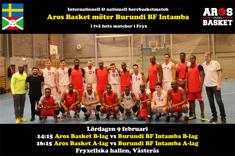 Nu på lördag den 9 februari möter Aros Basket Burundi BF Intamba som är en förening bestående av basketspelande Burundier som bor i Sverige. Det här är det andra tilfället som dessa två lag drabbar samman och senast var den 4 mars 2017. Det blir två matcher då båda lagen har en bred herrverksamhet. Först ut kl 14:15 är B-lagen och därefter kl 16:15 spelar A-lagen. Senast var det en stor publikfest så kom och heja. Aros Basket 7 feb 2019 0kommentarer