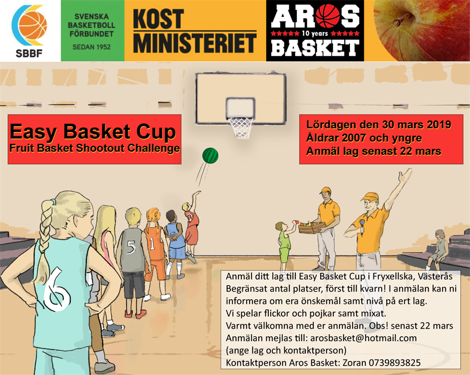 Anmäl ert lag till Easy Basket i Fryx lördagen den 30 mars. Vi vill ha er anmälan senast fredagen den 22 mars. Det kommer att bli en Fruit Basket Shootout Challenge där vi kommer att dela ut frukt till samtliga deltagare på ett roligt sätt. Aros Basket 13 mar 2019 0kommentarer