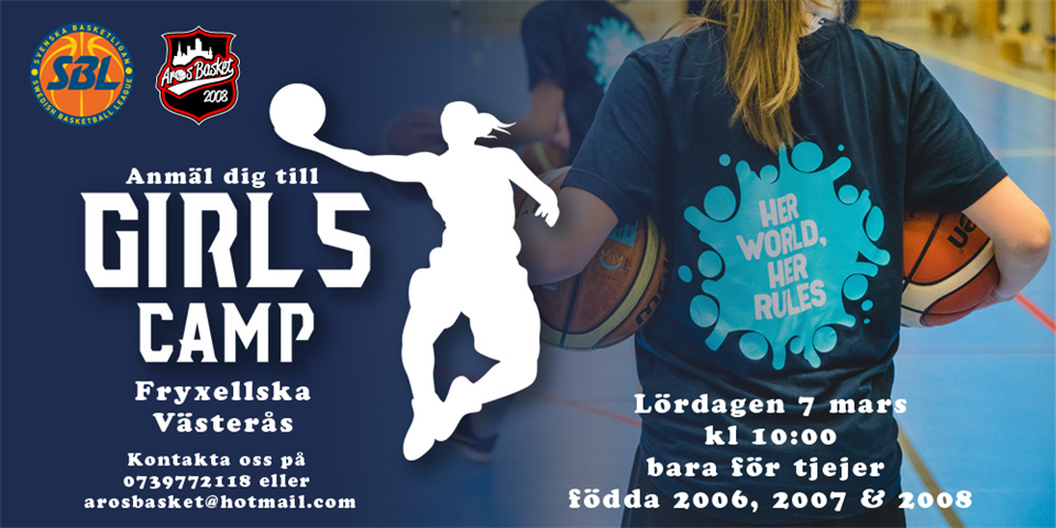 Välkommen till Girls Camp som är ett samarbete mellan Svenska Basketbollförbundet och SBL dam med stöd av FIBAs kampanj “Her world. Her rules… Welcome to my playground!“. Målgruppen för detta basketläger är först och främst U13 och U14-tjejer. Syftet med lägret är att tjejerna, oavsett kunskap och tidigare erfarenhet, ska få umgås tillsammans och få ta del av så mycket basketglädje som möjligt och inspirera varandra till att fortsätta spela basket. Lägret är gratis och vi startar igång det kl 10:00 på lördag. Alla deltagare får en t-shirt. Programmet är preliminärt enligt följande: 09:30 samling coacher för genomgång. 10:00-11:45 Pass 1 12:00-13:00 Lunch 13:00-14:00 Presentation och frågestund. 14:00-16:00 Pass 2 Anmäl dig till din ledare som kontaktar oss eller kontakta oss via arosbasket@hotmail.com eller 0739772118.