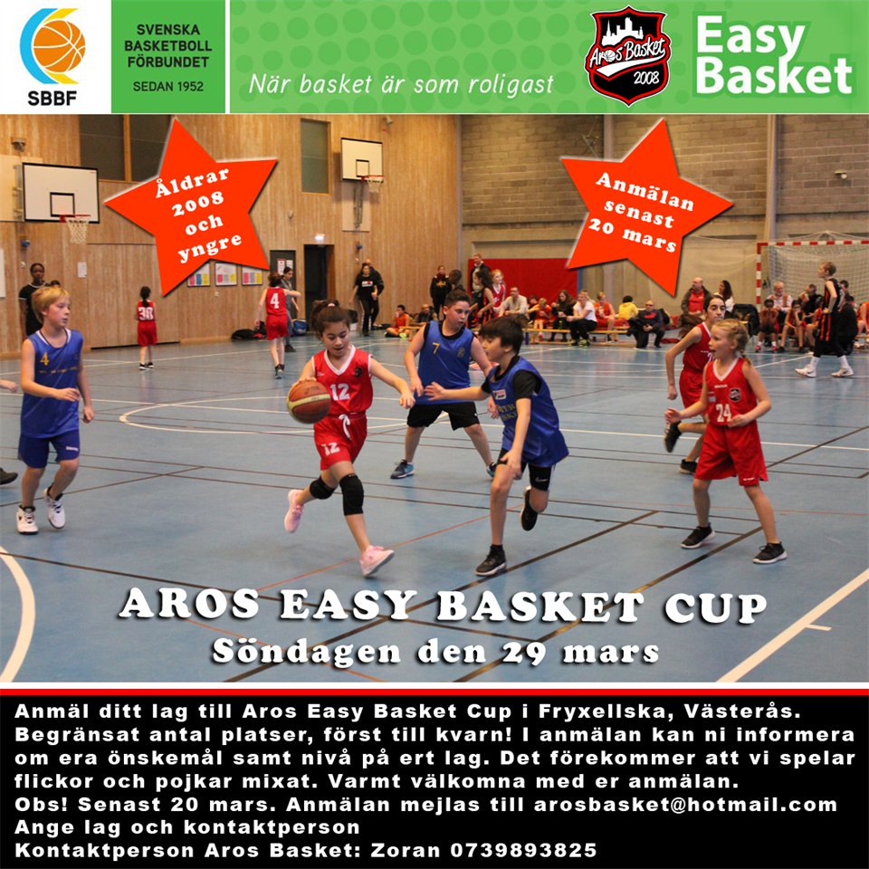 Nu är det dags för Easy Basket i Fryxellska, Västerås När: Söndagen den 29 mars 2020 Åldrar: 2008 och yngre indelade i två åldersklasser Laganmälan: senast 20 mars Anmäl ditt lag till Easy Basket Cup i Fryxellska, Västerås. Preliminära tider: 09:00-17:00 (yngre först och därefter äldre) Kiosk finns på plats. Begränsat antal platser, först till kvarn! I anmälan kan ni informera om era önskemål samt nivå på ert lag. Vi spelar flickor och pojkar samt mixat. Varmt välkomna med er anmälan. Obs! senast 20 mars. Anmälan mejlas till: arosbasket@hotmail.com (ange lag och kontaktperson) Kontaktperson Aros Basket: Zoran 0739893825