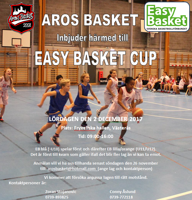 Aros Basket inbjuder härmed till Easy Basket i Fryxellska, Västerås lördagen 2 december. Anmälan vill vi ha oss tillhanda senast söndagen den 26 november till: arosbasket@hotmail.com (ange lag och kontaktperson) EB blå (-U10) spelar först och därefter EB lilla/orange (U11/U12). Det är först till kvarn som gäller ifall det blir fler lag än vi kan ta emot. Kontaktpersoner är: Zoran Stojanovic 0739-893825 Conny Åslund 0739-772118