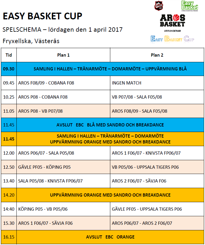 Aros Basket arrangerar Easy Basket Cup för 2005 & yngre i Fryxellska lördagen den 1 april. Det är 15 lag anmälda där varje lag kommer att få spelar två matcher. Speltid enligt följande: EBC BLÅ dvs barn 08/09 kommer att spela 6 x 5 min EBC ORANGE spelar efter gällande regler 4 x 8 min Regler för blå grupp, se här och för orange grupp, se här. Har ni frågor på detta så kontakta gärna Zoran Stojanovic 0739-893825 som kommer att vara på plats på söndag. Kom och heja på barnen Aros Basket 30 mar 2017 0kommentarer